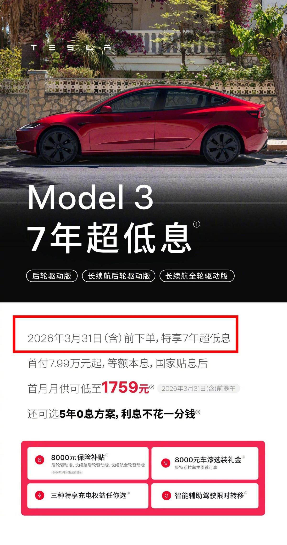 最后,对于咱们普通的消费者而言,特斯拉此番优惠无疑是一个不错的购车时机。我们完全可以根据资金状况选择"5年0息"锁定总成本,或用"7年超低息"换取更低的月供压力。不过,政策截止到3月31日,且1月已有类似活动,这种"限时"本身也是一种促进转化的营销策略。最关键的,就看你是想要省下这1万多的利息,赶紧上车,还是再观望观望了。(文/优视汽车 大卓 )