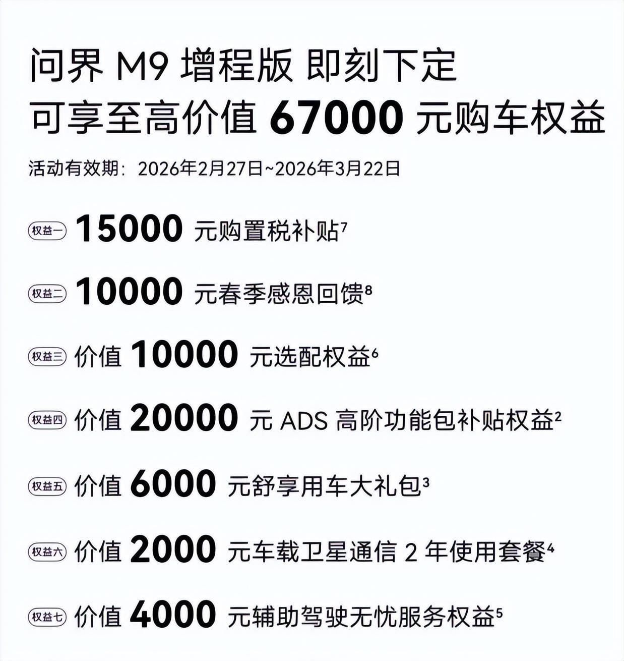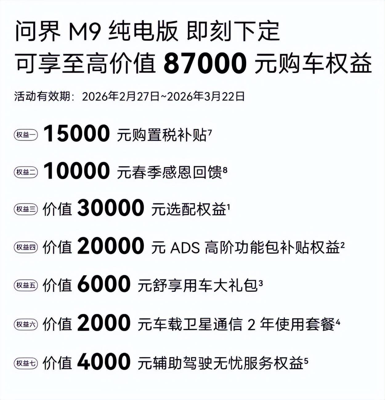 值此春日出行季,问界M9更推出限时购车重磅礼遇。即日起至3月22日,下定问界M9至高可享87000元购车权益,涵盖购置税补贴、春季感恩回馈及ADS高阶功能包补贴等多重福利,以真金白银的优惠,让触手可及的科技豪华,陪伴每一位用户奔赴春日山海,解锁更多出行美好。