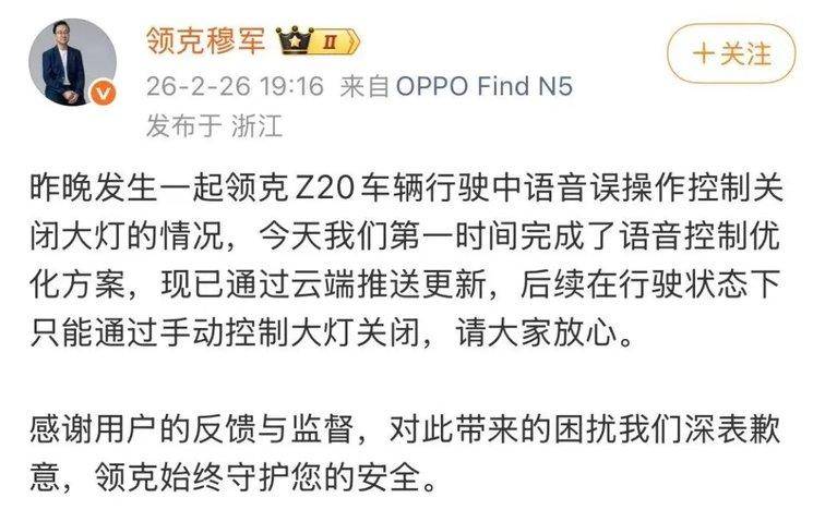 2026年2月25日凌晨,领克Z20车主在无路灯的高速公路上,发出“关闭阅读灯”的语音指令,搭载的LYNK Flyme Auto车机却出现严重识别错误,误将指令判定为“关闭全车灯光”。