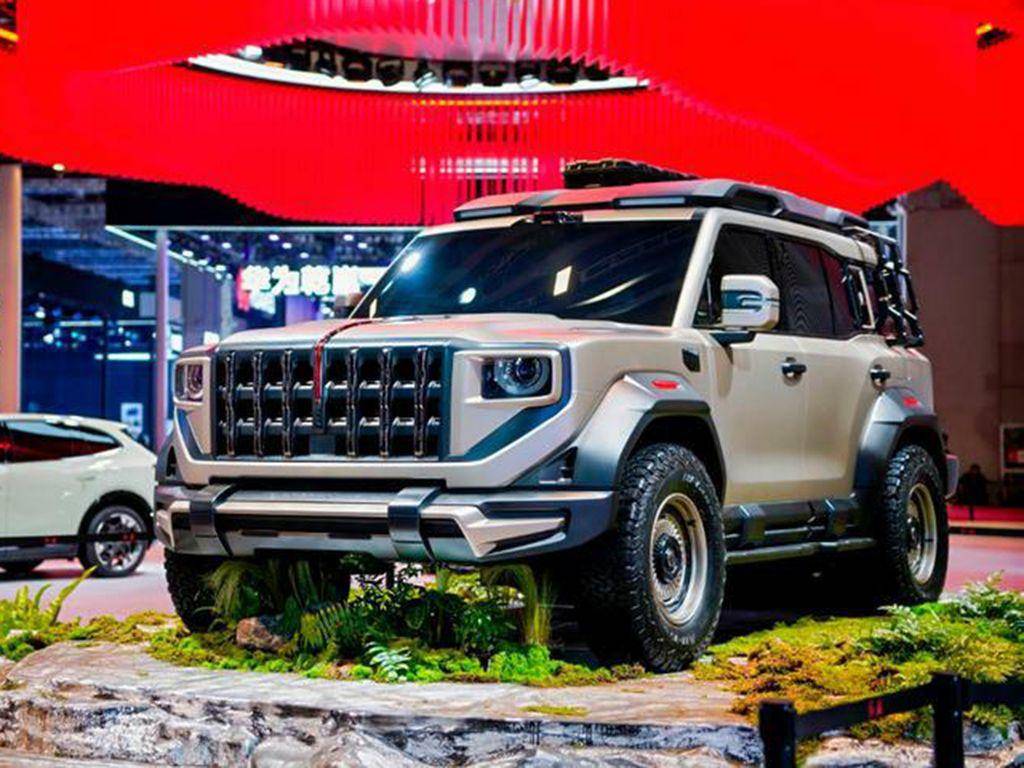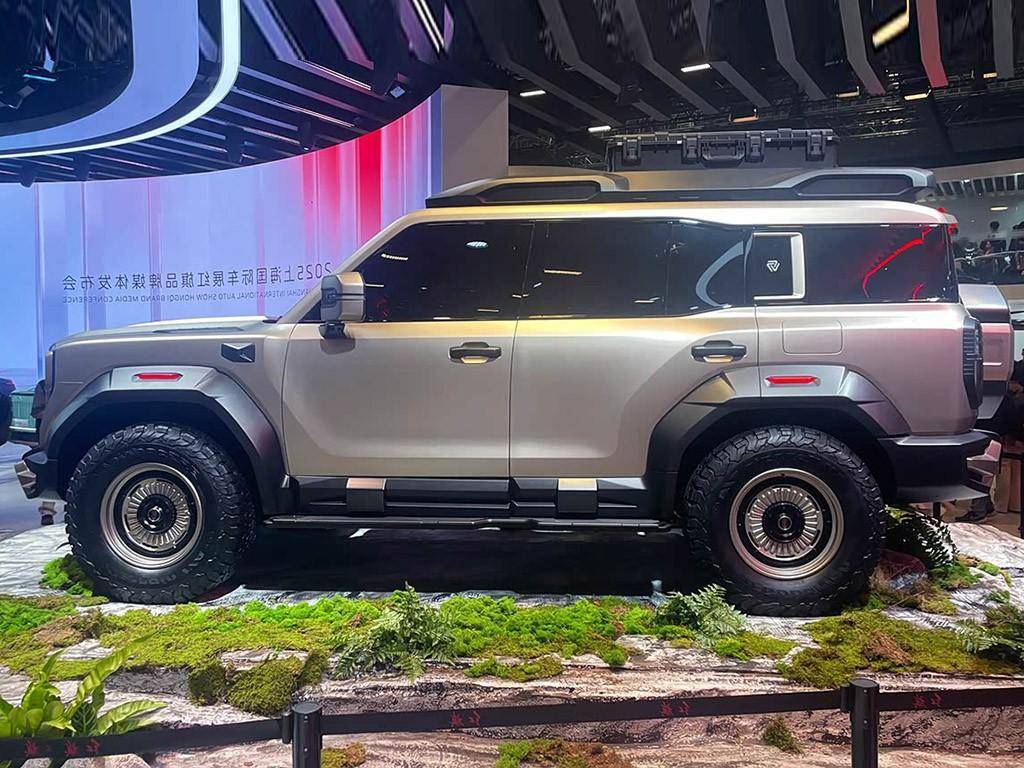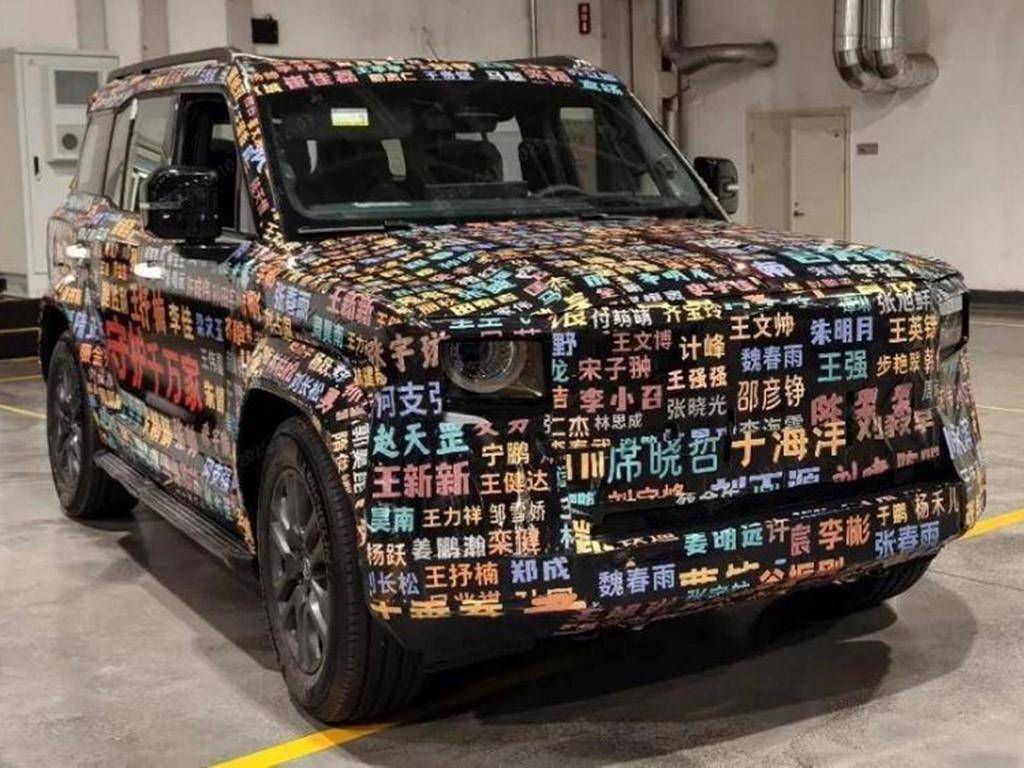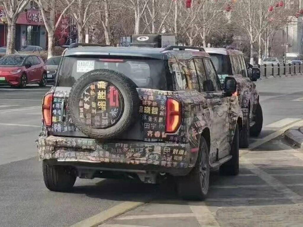 往上走,我们能看到车顶配有激光雷达和行李架,左右两侧的后视镜也是用的这种长方形设计,看起来和目前市面上在售方程豹豹5、坦克400等车型并无二样。