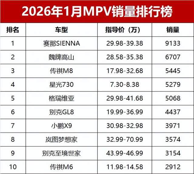 在乘联会刚发布的2026年1月MPV销量中,第一名直接被丰田赛那拿下,销量高达9133辆,同比还涨了35%,不过由于冬季油车确实更加的畅销,3月份能够维持就非常不错了。