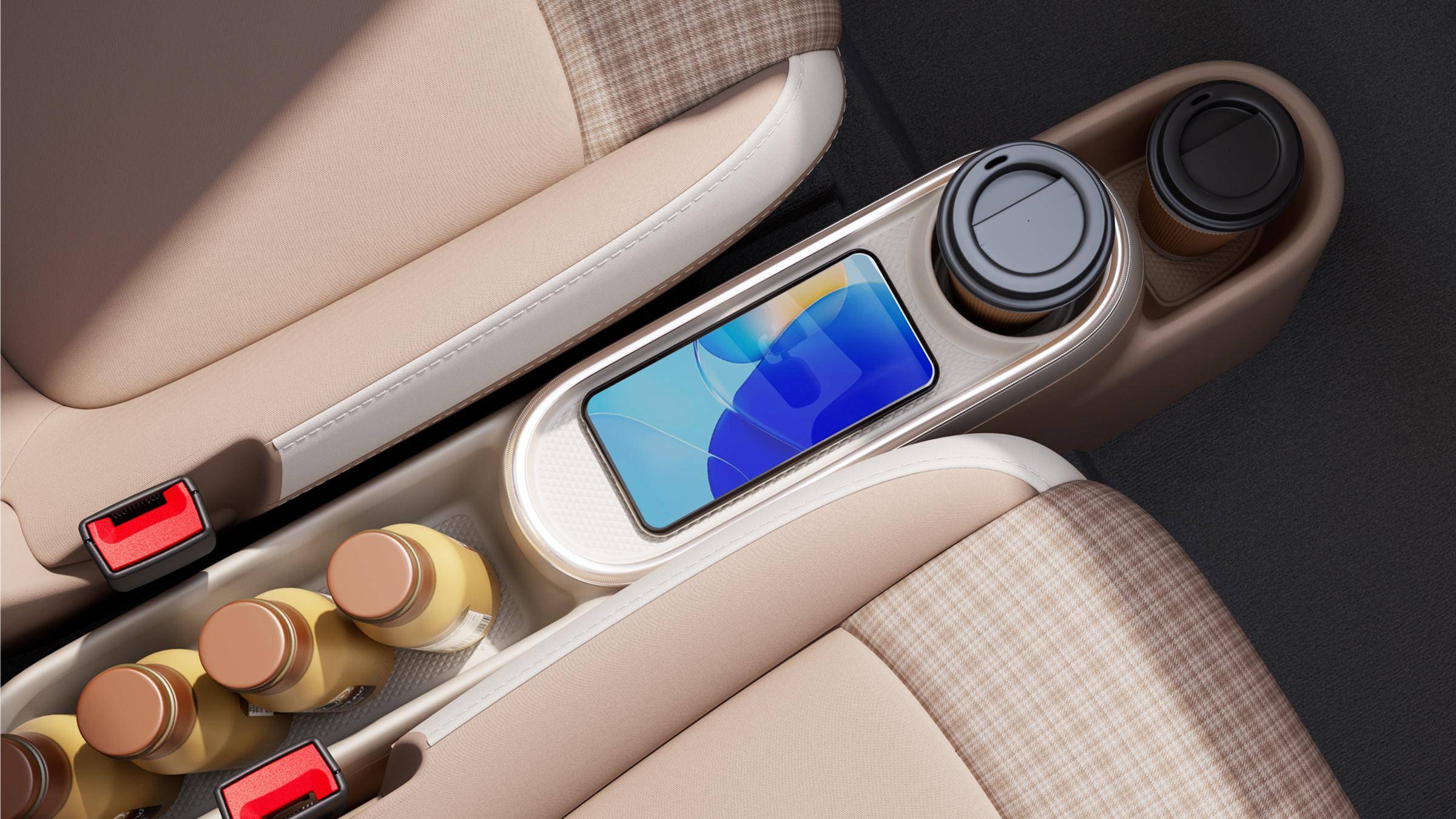 首先,第五代宏光MINIEV的内饰采用了“环趣美学”设计理念:从字面理解,“环”指向环形元素在视觉上的贯穿,“趣”则是五菱希望用户在车内感受到的情绪体验。细看之下,环形元素确实贯穿了多个细节,比如它的门饰板采用“环扣交融”的设计语言,线条环绕再聚拢,形成一种包裹感;副仪表台被设计成“灵动岛”样式,同样融入环形特征,并整合了杯架和储物槽,可同时容纳两杯饮品,奶茶、咖啡等,都能轻松放下。