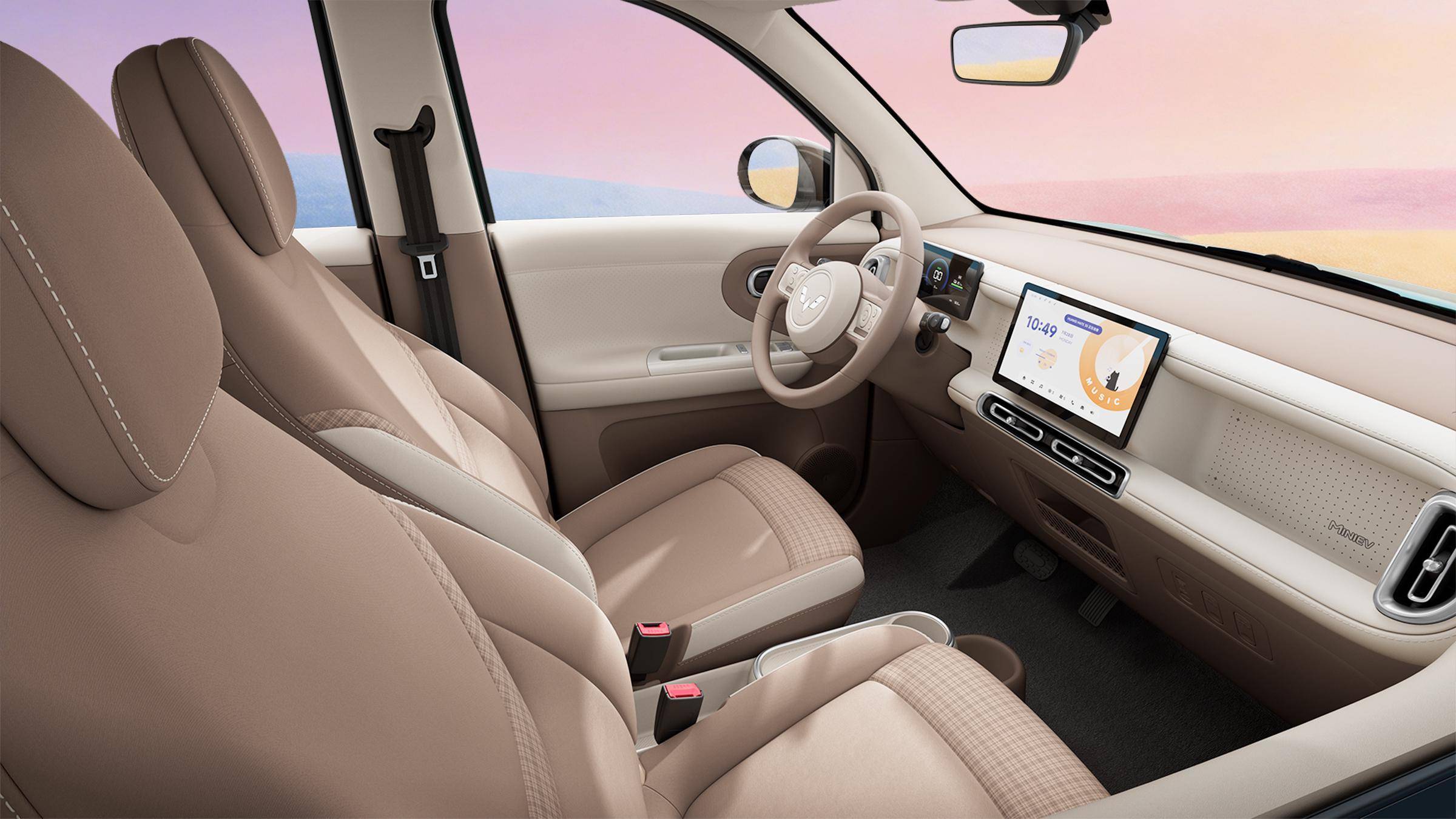 这还没完,第五代宏光MINIEV内饰还采用“焦糖奶油”配色方案,主色调是温暖偏深的焦糖色,搭配柔和明亮的奶油白,两种色调在仪表台、门板、座椅等区域形成错落有致的拼接;同时其座椅采用棕白格趣设计,格子纹路的加入让视觉层次更丰富,整体氛围在复古与简约之间找到了平衡。
