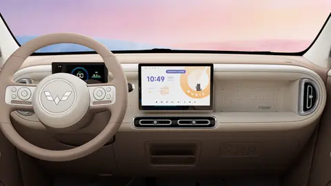 内饰方面,第五代五菱宏光MINI EV采用全新的设计语言,简约的环状操作台搭配悬浮式液晶仪表以及中央10.1英寸车机大屏,同时老款车型上旋钮换挡机构也被更换为电子怀挡,同时车内物理按键也迎来取消,整体更为简洁,同时科技感也更强。