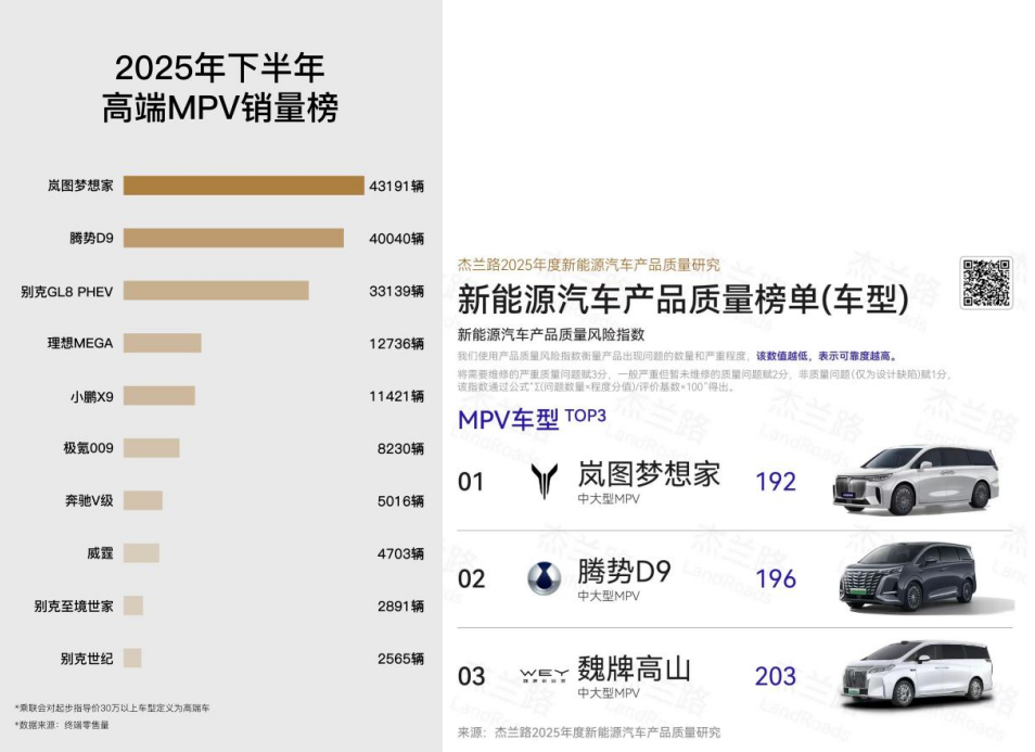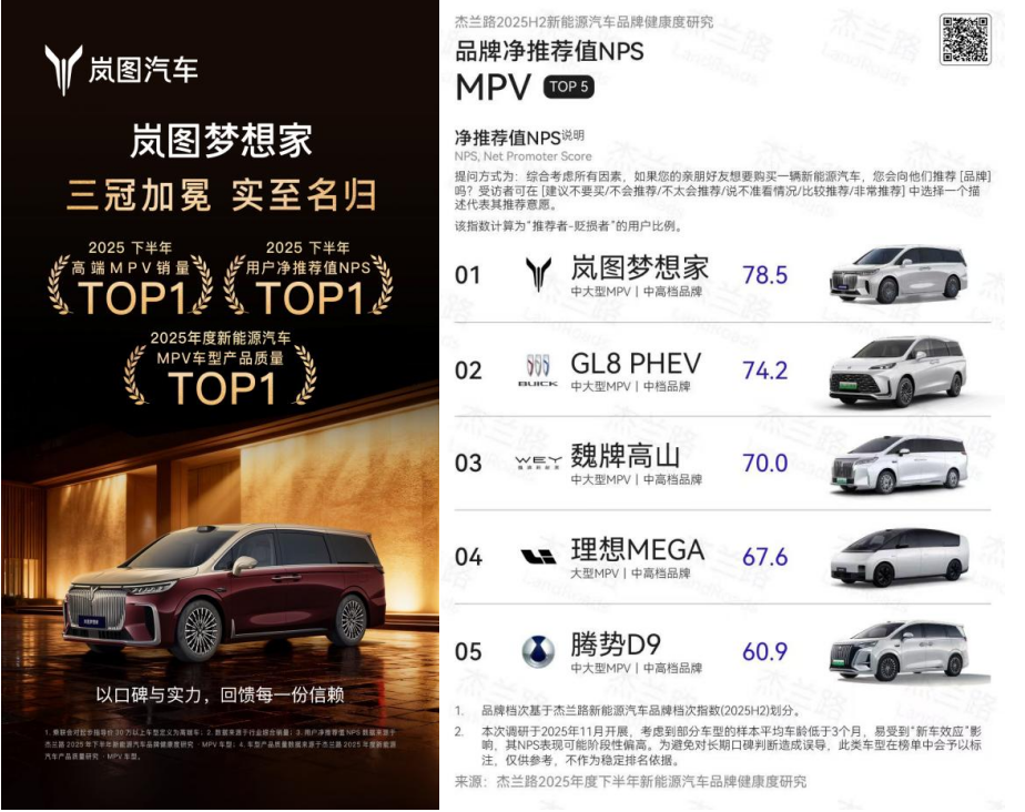 至于为什么叫“冠军版”?这个名号可不是随便起的。熟悉MPV市场的朋友可能知道,岚图梦想家本身就是个“奖牌收割机”:它是中国高端MPV销量第一,是用户净推荐值(NPS)第一,还是新能源MPV质量第一。销量、口碑、质量,三项全能,妥妥的“三冠王”。