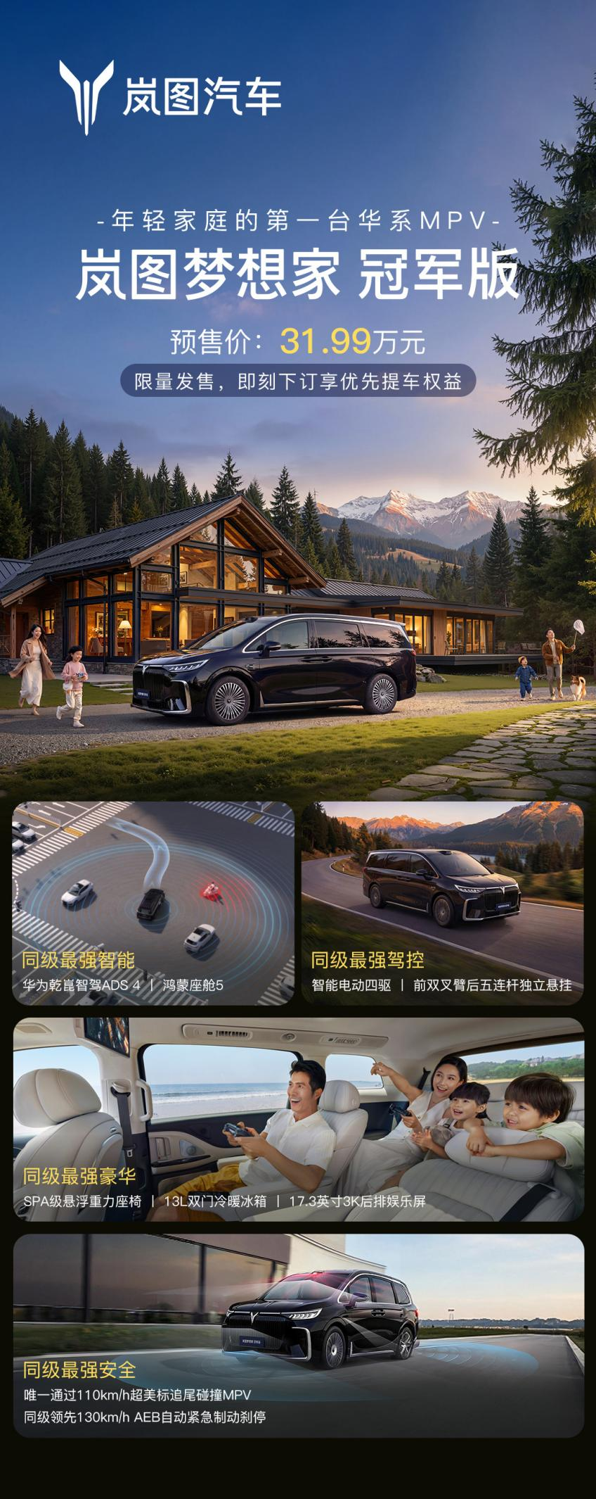 岚图梦想家冠军版的推出,正是为了告诉那些精挑细选的年轻家庭:在30万这个价位,终于有了一款不需要你做任何妥协的车。它是销量冠军、口碑冠军、质量冠军,如今更是智能与价值的“冠军”。