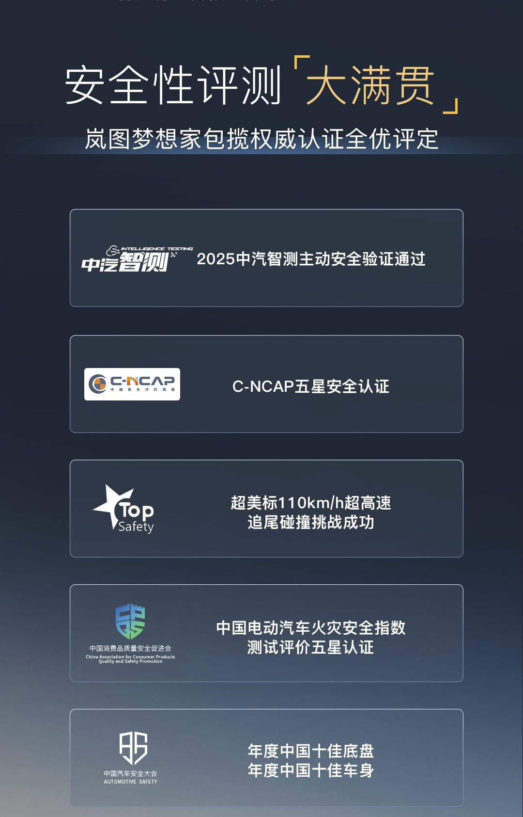 很多家庭不敢让小孩坐第三排,就是因为离后窗太近,总担心被追尾。还有些车AEB(自动紧急制动)时速上限低,上了高速基本就是摆设。而岚图梦想家冠军版则把安全拉到了“满级”。