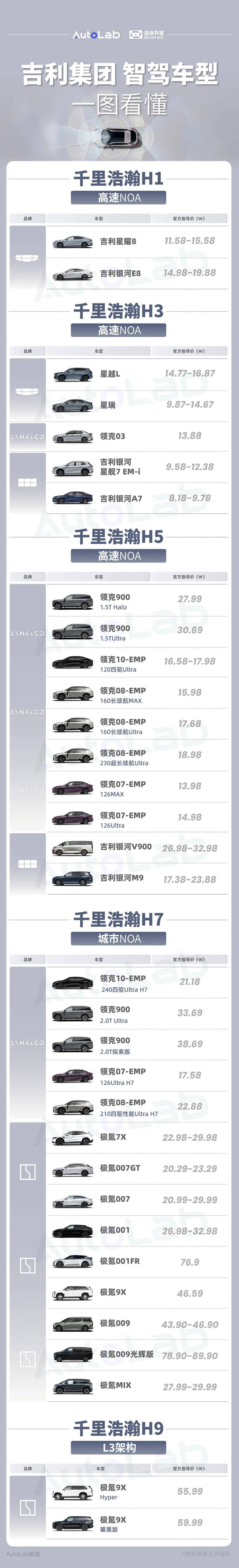 我们整理出一份榜单,带你一图了解吉利集团的智驾车型。