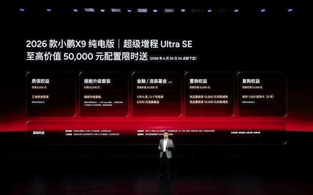 即日起至2026年4月30日24点(含)前下定2026款小鹏X9纯电版,可享最高价值50,000元 权益限时送,包含三电终身质保、价值12,000元的座舱升级套装、至高价值30,000元金融/选装基金、至高价值15,000元置换权益以及每年1500度电卡(6年)的复购权益。2026款小鹏X9超级增程权益与2026款纯电版权益一致(2026年3月31日24:00前下定),此外24和25款的小鹏X9车主置换26款小鹏X9可以获得额外1万元的代金券补贴。(2025年11月20日已发放)