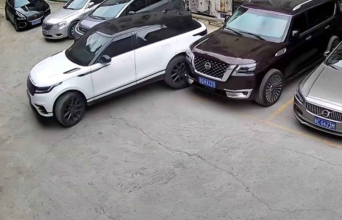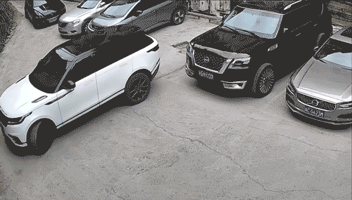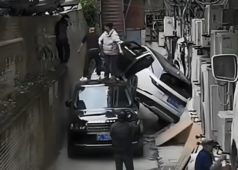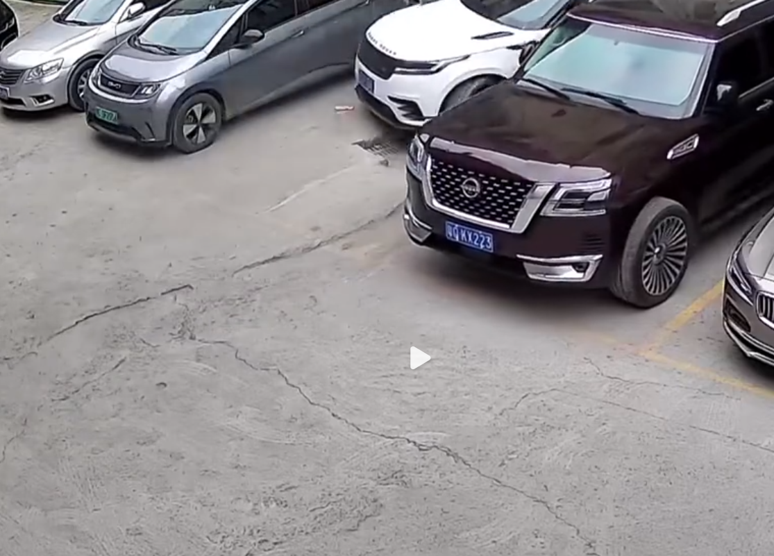 2026年3月1日,贵州遵义,一名司机在某狭窄的停车区域里驾驶路虎SUV倒车;倒车的过程中司机错误的把油门当成了刹车,随后剐蹭到左侧的一辆日产途乐汽车,随后坠落过程中又砸到一辆路虎揽胜。