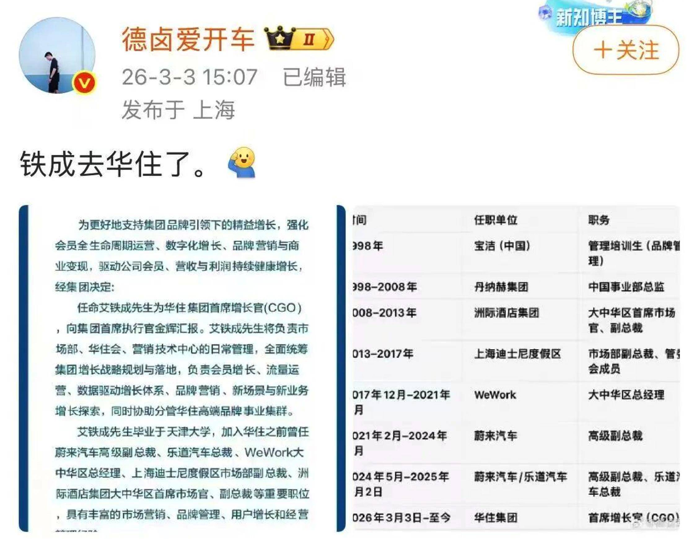根据汽车博主“德卤爱开车”释出的内部任命截图,艾铁成已被正式任命为华住集团的首席增长官(CGO),直接向集团首席执行官金辉汇报。