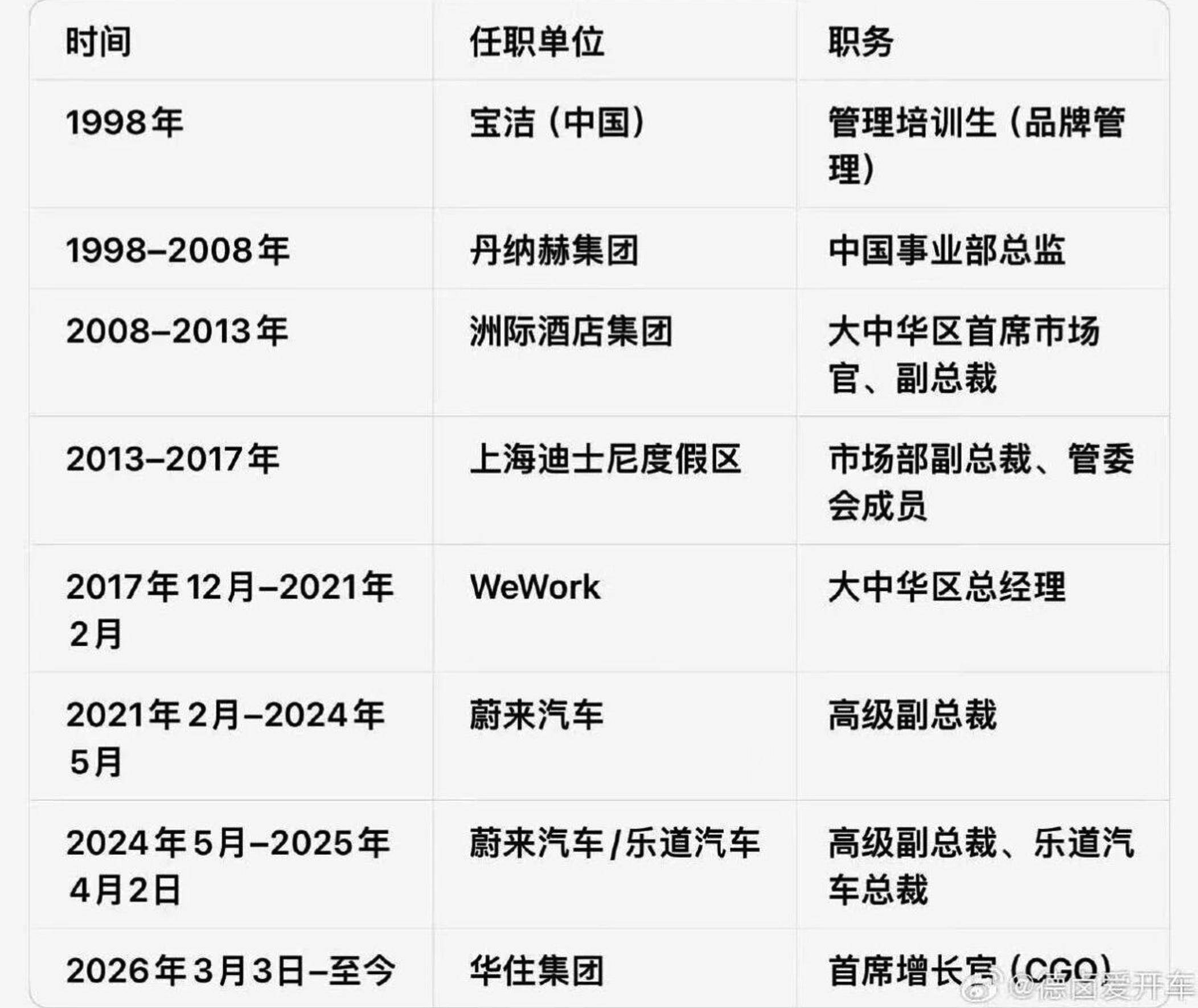 在跨界造车之前,他曾历任洲际酒店集团大中华区首席市场官、上海迪士尼度假区市场部副总裁以及WeWork大中华区总经理。