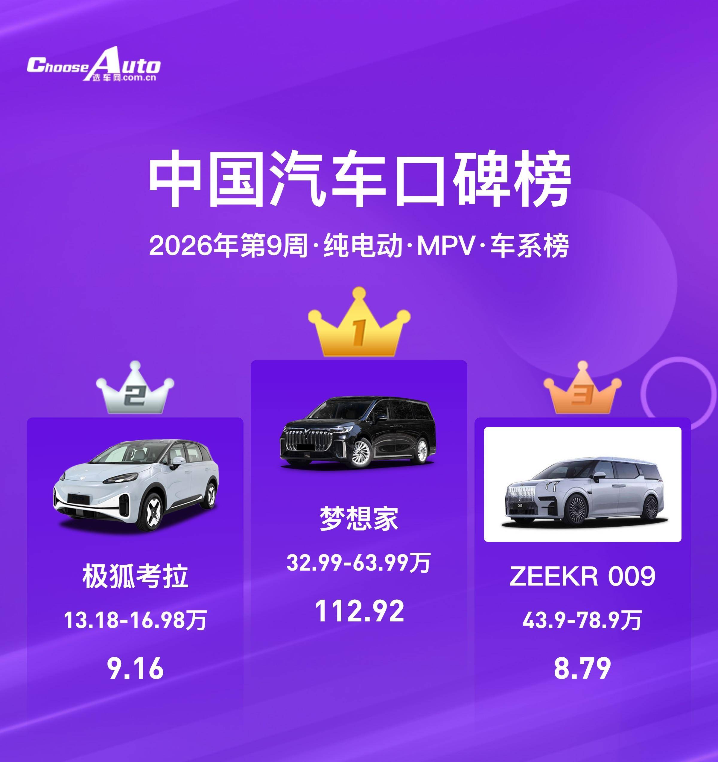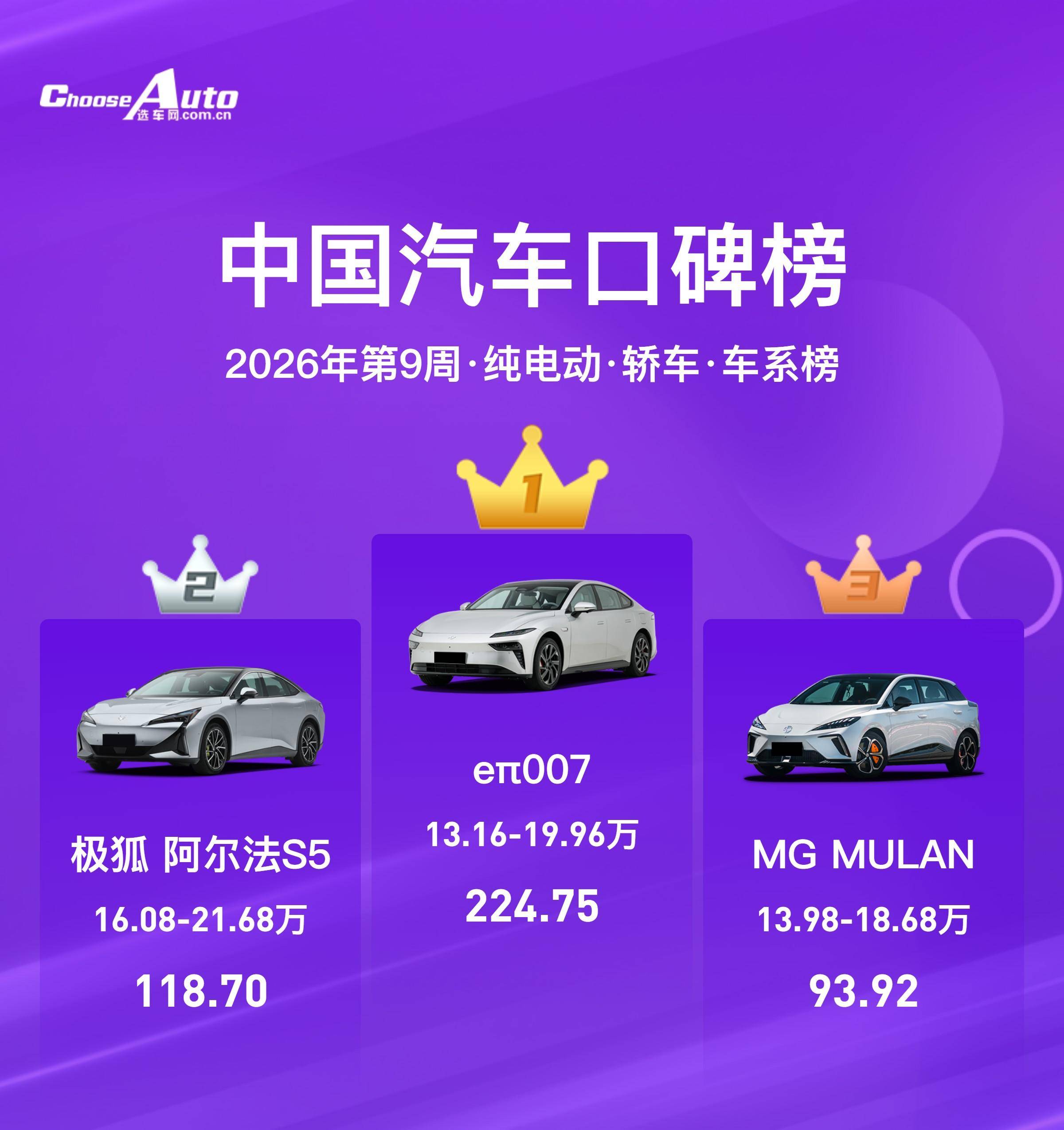 近日,选车网发布了2026年第9周纯电动细分市场的“中国汽车口碑榜”。对于正在持币待购的消费者来说,这份榜单不仅仅是冰冷数字的排列,更是一份关于“人心向背”的真实写照。当我们从公众视角去审视这三张图片时,会发现两个非常有趣的现象:轿车领域呈现“断崖式”的审美偏好,而MPV市场则陷入了一种“叫好与叫座”的微妙博弈。