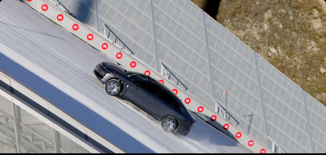 有实力,无惧任何挑战。发布会前,昊铂A800凭借这套底盘系统的加持,顺利登顶国家跳台滑雪中心“雪如意”,面对85米垂直落差、125米坡长、37.1度最大坡度,克服冰雪湿滑、陡坡等多重极端条件,完成了行业第一个双人冲坡挑战,实现对经典豪华极限爬坡能力的正面超越。