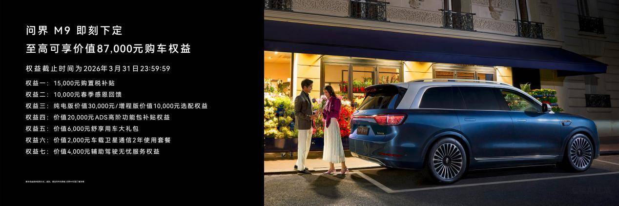 在本次技术焕新发布会上,问界M9迎来重磅升级,首发搭载新一代双光路图像级激光雷达。作为迄今为止全球量产线数最高的激光雷达,其具备超高清、超远距、超精准三大核心优势,对于小体积目标以及低反射率障碍物的识别距离实现大幅跃升,整体实现感知能力的跨越式突破。基于全新激光雷达的升级,问界M9搭载的全向立体融合感知系统再度进化,全车配备36个高精度传感器,构建起更强大的感知网络。搭载全新一代激光雷达的问界M9,于2026年3月4日发布后同步开放下定,建议零售价47.98万元起,即刻下定,可享1.5万元购置税补贴,产品选配金权益、ADS高阶包赠送等多重权益,首销权益于2026年3月31日截止。
