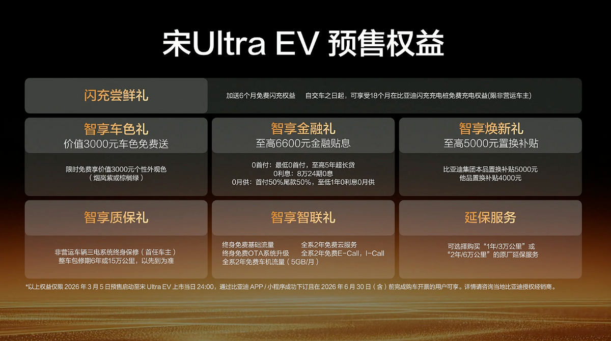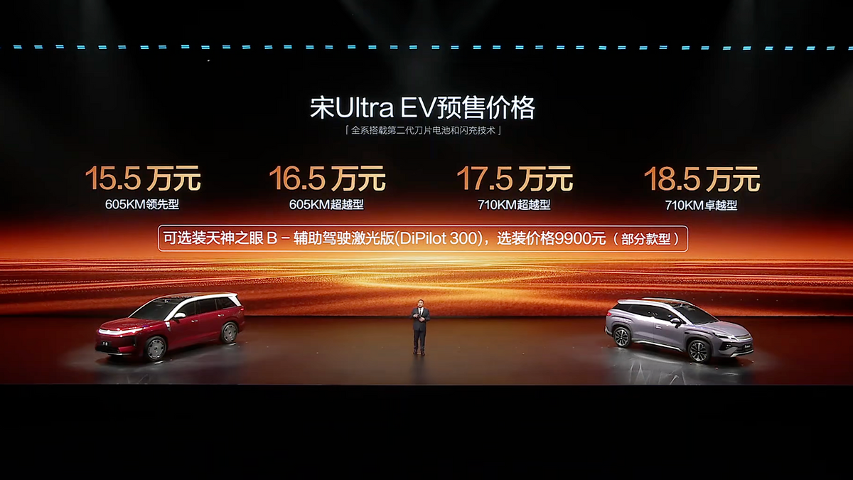 比亚迪王朝接住这一领先技术,搭载二代刀片电池的比亚迪王朝全新B级纯电SUV——宋Ultra EV开启预售,价格为:15.5万元-18.5万元,将在3月底上市,并且自交车之日起,可享受18个月免费闪充权益。