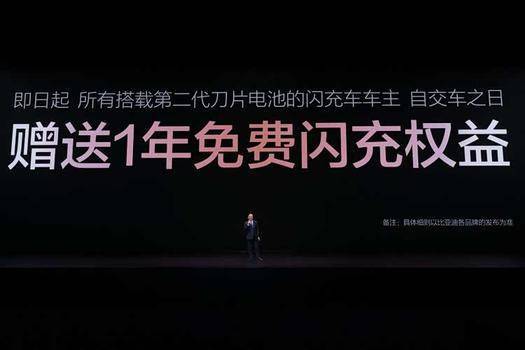 发布会现场,王传福还宣布:所有搭载第二代刀片电池的闪充车车主,均享有重磅“闪充权益”,自交车之日起,在全国闪充站可享受1年的免费闪充权益,让闪充体验更畅快。并且,在闪充免费期结束后,也会同行业保持一致,不会额外收费。