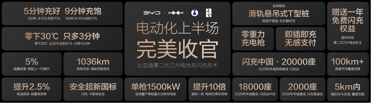 第二代刀片电池及闪充技术的发布,与“闪充中国”战略的落地,标志着 “充电慢”、“低温充电难”这两大世界性难题已被攻克,新能源汽车电动化的“上半场”至此完美收官。