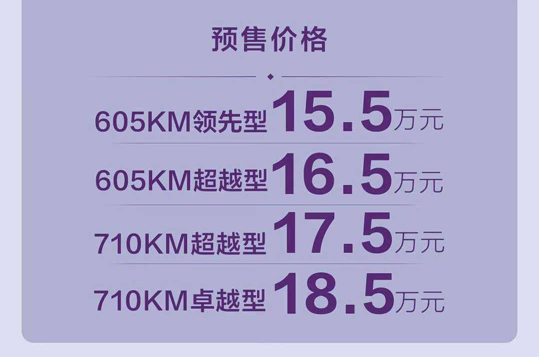 最后是预售18.5万元的710KM卓越型,它比此前一个版本又贵了1万元,在电机数据和续航都一致的情况下,它多了26英寸W-HUD抬头显示、前排座椅4向腰部支撑、主驾8向电动调节、副驾电动腿托、车载冰箱、智能香氛系统、19英寸低风阻铝合金轮毂等。