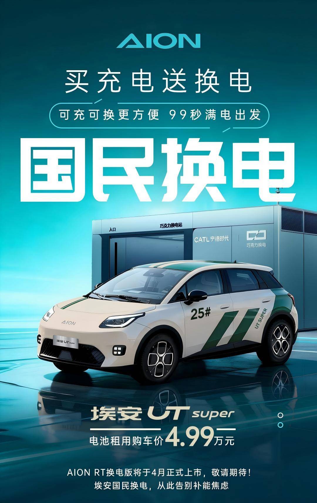埃安正以“车+站”双轮驱动,加速国民换电产品的普及。据悉,今年4月,埃安RT换电版也将正式推出。未来,换电技术将覆盖更多埃安车型,让更多国民轻松迈入“可充可换、随心补能”的新时代。