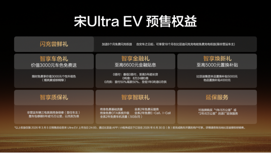 《车矩阵》新车一手料:2026年3月5日,比亚迪王朝B级闪充SUV 宋Ultra EV正式开启预售,全系搭载比亚迪第二代刀片电池及闪充技术,同时配备多项奢适配置。新车预售价15.5-18.5万元。同时,预订用户还将享受整整18个月免费闪充权益。