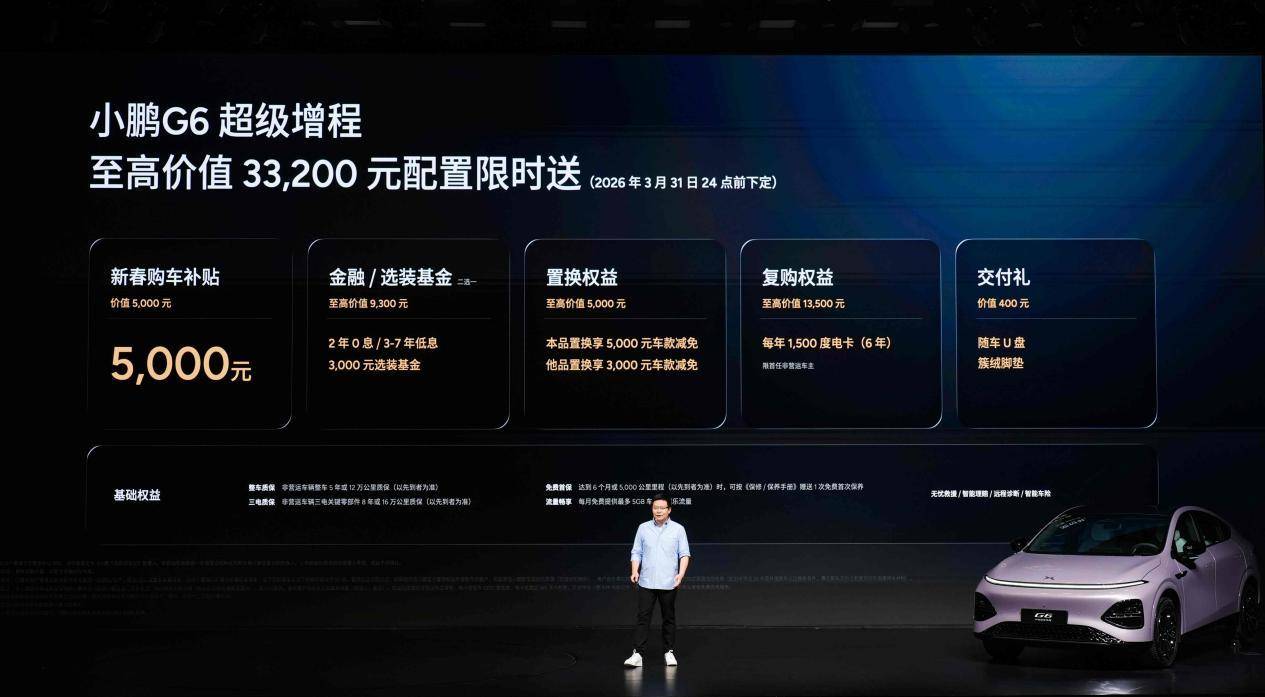 2026年3月6日,小鹏汽车举行小鹏G6超级增程上市发布会,新车定位六项全能AI增程SUV,以“六项全能 一步到位”为核心,凭借同级综合续航第一、同级补能速度第一、同级车端有效算力第一、同级最强底盘系统、同级最强主动安全和同级得房率第一的六大核心优势,打造真正满足用户全场景需求的国民车。本次发布小鹏G6超级增程1704 Max,官方指导价为18.68万元,用户可选装两个智能升级包,加购12,000元升级为Ultra SE版本、加购20,000元升级为Ultra版本。即日起至2026年3月31日24点前下定小鹏G6超级增程,可享至高价值33,200元限时权益礼包,包括5,000元新春购车补贴、至高价值9,300元金融/选装基金(二选一)、至高价值5,000元置换权益、至高价值13,500元复购权益和价值400元交付礼。