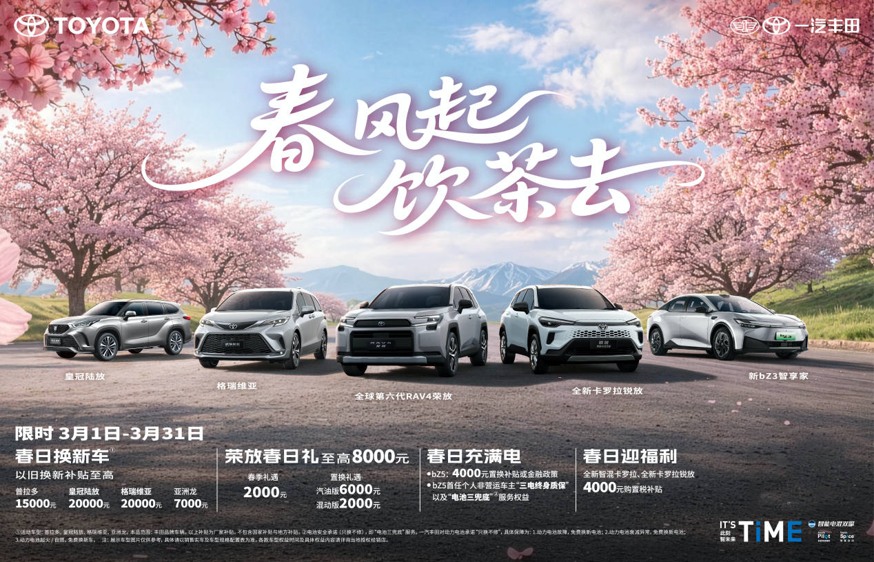 三月春光正好,购车良机已至。不妨前往一汽丰田各地经销店,亲身体验全明星车型的独特魅力,带走属于您的春日限定好礼。