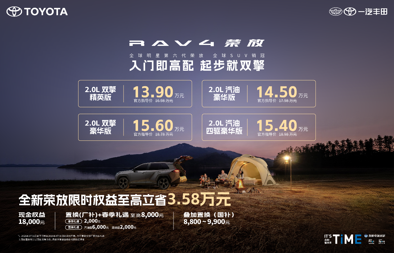 惊喜不止于价格,还有重重福利。2026年3月31日前下订荣放全系并在4月30日前开具发票的用户,即可享受一汽丰田提供的包括春季礼遇和置换补贴在内的至高8000元春日礼。这还不够,用户还可同步享受至高约万元的国家补贴。价格直降1.8万元、厂补至高8000元,再享受国补至高约万元,综合折算,购买全新荣放,真金白银至高立省3.58万元。