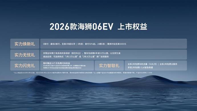 从全新闪充和第二代刀片电池为主的颠覆性技术赋能,到智能、舒享、颜值、驾控、安全的五大维度升级,2026款海狮06EV此次焕新,无疑是一次全方位、高标准的自我超越。它不仅体现了比亚迪在新能源技术领域的硕果,更精准满足了当下消费者的高品质出行需求。2026款海狮06EV将继续引领市场风潮,陪伴更多家庭用户开启更加美好的绿色出行新篇章。目前新车已抵达比亚迪海洋网各大门店,欢迎用户到店品鉴试驾。