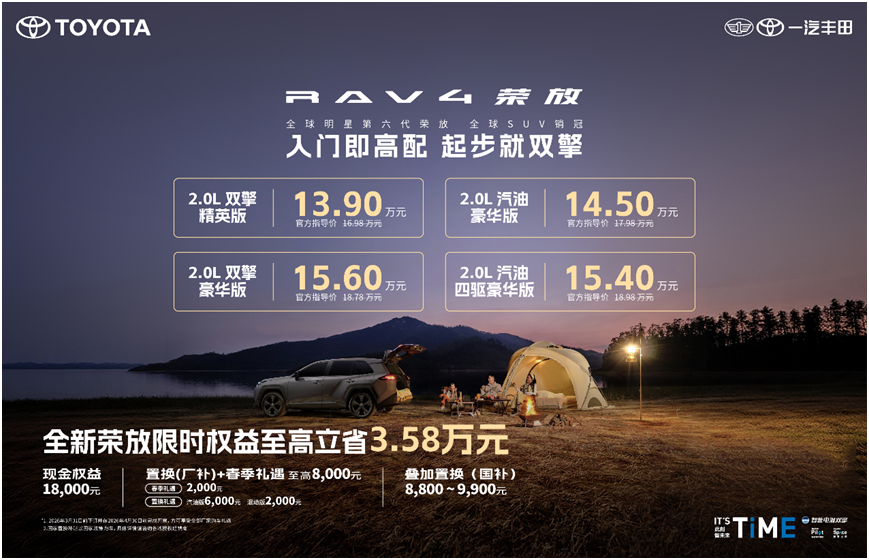 惊喜不止于价格,还有重重福利。2026年3月31日前下订荣放全系并在4月30日前开具发票的用户,即可享受一汽丰田提供的包括春季礼遇和置换补贴在内的至高8000元春日礼。这还不够,用户还可同步享受至高约万元的国家补贴。价格直降1.8万元、厂补至高8000元,再享受国补至高约万元,综合折算,购买全新荣放,真金白银至高立省3.58万元。