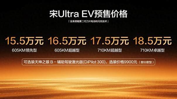 【车媒体丨新车】2026年3月5日,比亚迪王朝B级闪充SUV 宋Ultra EV正式开启预售,全系搭载比亚迪第二代刀片电池及闪充技术,同时配备多项奢适配置。新车预售价15.5-18.5万元。同时,预订用户还将享受整整18个月免费闪充权益。