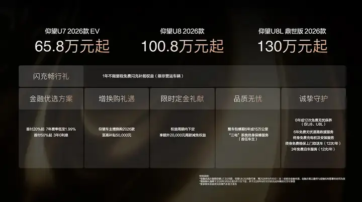 此外,仰望汽车还推出了闪充畅行礼遇,2026年5月11日(含)前支付2026款仰望车型定金的用户,自交付之日起,可享受一年内在比亚迪闪充充电桩免费充电权益(限非营运车主)。