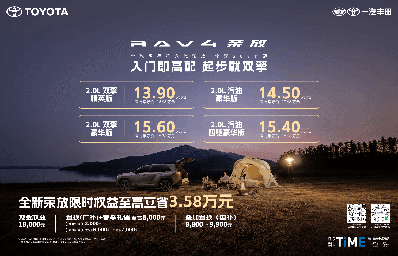 惊喜不止于价格,还有重重福利。2026年3月31日前下订荣放全系并在4月30日前开具发票的用户,即可享受一汽丰田提供的包括春季礼遇和置换补贴在内的至高8000元春日礼。这还不够,用户还可同步享受至高约万元的国家补贴。