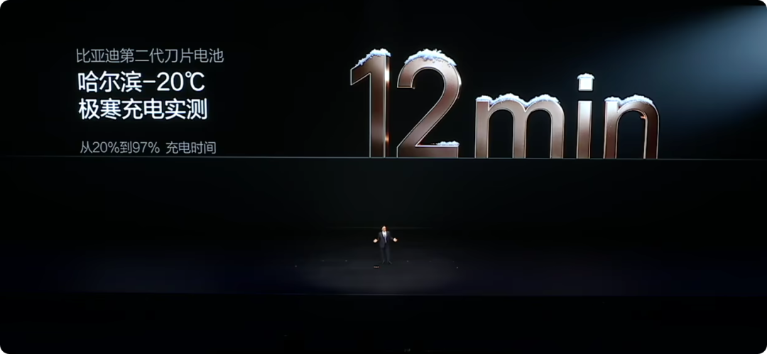 王传福在现场展示了一段哈尔滨零下20摄氏度的极寒充电实测视频。一辆搭载第二代刀片电池的测试车(大唐),在冰天雪地中静置24小时后,把电池冻透了以后,插上充电枪,计时器跳动,11分钟后,电量从20%攀升至97%。