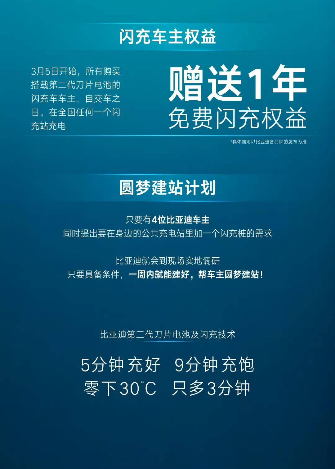 更暖心的是权益:搭载第二代刀片电池的闪充车,交车后享1年免费闪充,免费期后也不额外加价。后续还搞“圆梦建站”,4位车主提需求,符合条件就建站,还向全社会开放共享。