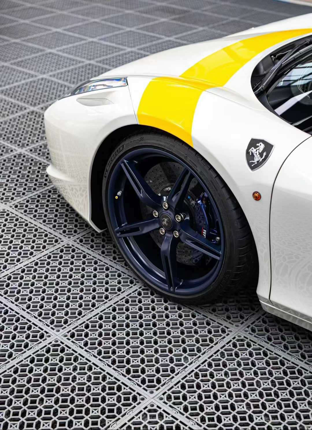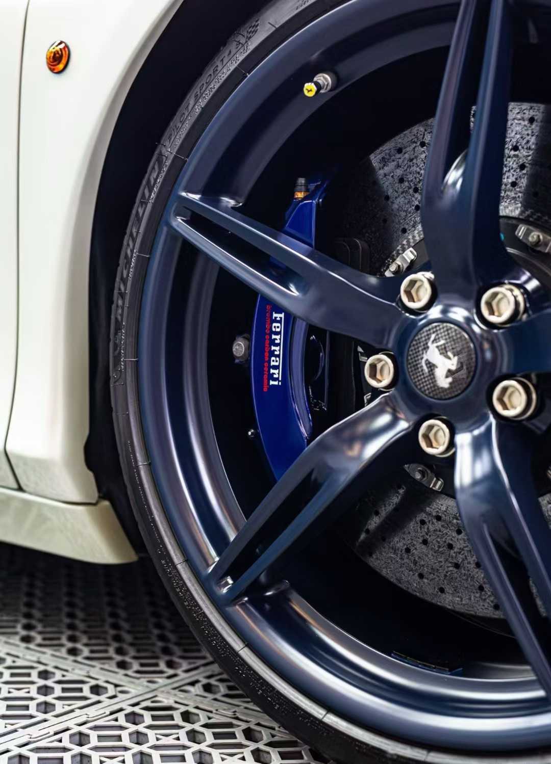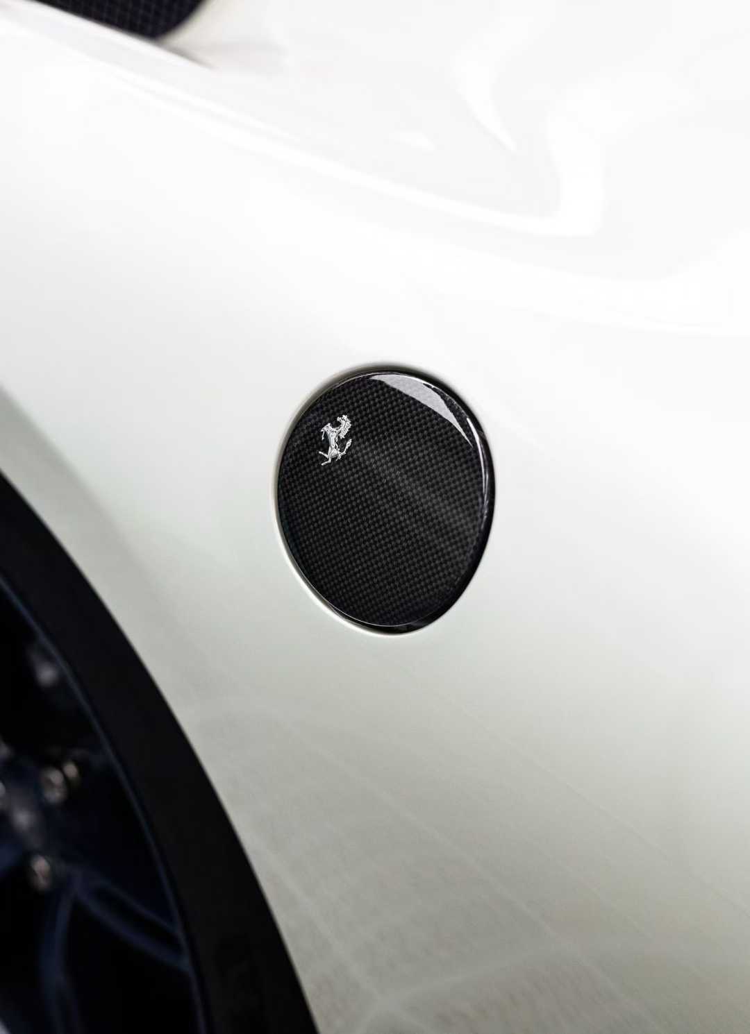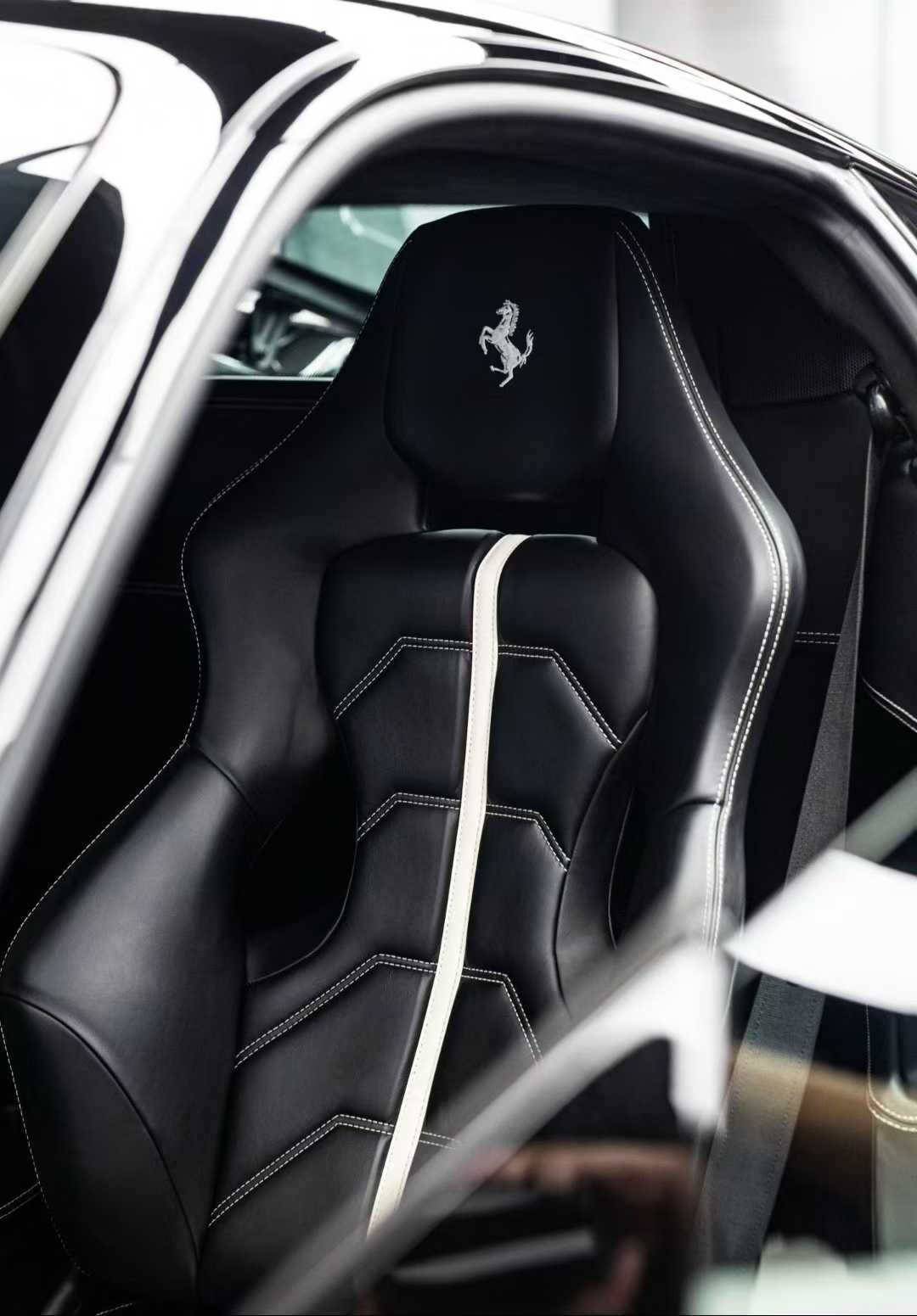 初见这台车,你会被它的配色所吸引。作为Tailor Made高定部门的杰作,它身着原厂珍珠双拼色。这抹独特的蓝色,让人联想到法拉利官方杂志中那位叫做艾玛(Emma Hague)的车主故事——她曾走进马拉内罗定制中心,只为调配出与心爱蓝宝石戒指相同的色彩 。那一刻,冰冷的机械被赋予了人性的温度。眼前的这台车也是如此,珍珠漆面在阳光下流转着温润的光泽,它不是赛道上一闪而过的魅影,而是一尊值得驻足凝视的艺术品。它告诉我们:真正的奢华,不是堆砌,而是在色彩中融入自己的故事与灵魂。