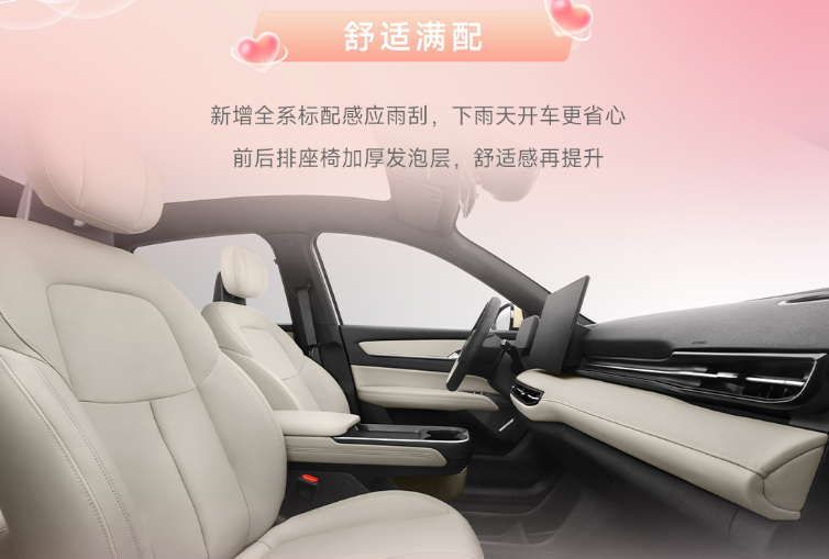 舒适满配,让家人惬意,也让她放松。全家出行,既怕孩子闹,又怕老人累。新车后排座椅增加15mm软泡层,柔软贴合、支撑扎实,宝贝睡得香,老人坐得舒服。前排座椅加热+主驾通风,一年四季都舒适。品牌同级首发AI大模型,依托Deepseek,更听得懂她的话,让她有求必有应。 雨雪天气出行不便,感应雨刮自动开启,从容又安全。360°全景影像,窄路会车不紧张,新手也更能一把入库。外后视镜能折叠能加热,洗完车不用探出身去掰。抱着娃腾不出手?有NFC/蓝牙钥匙呢,手机贴一下,车门开了。