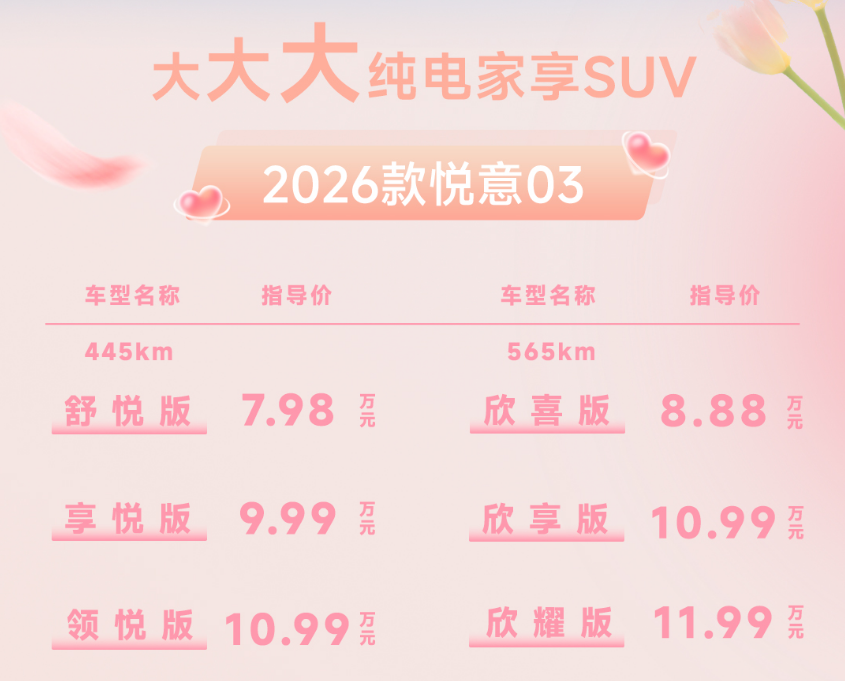 三月春暖,悦见花开。3月8日妇女节,实力演员张若昀直播助阵,“大大大纯电家享SUV”焕新而来,2026款悦意03挚爱上市,为每一位女神献上春天的礼物。445km、565km两种续航共计6款车型,官方售价7.98-11.99万元。围绕年轻小家庭,尤其是家庭女性用户的进阶需求,从颜色推新到舒适满配,2026款悦意03带来全新晨晖金车色、晨曦白内饰色等20余项升级,让用车更舒心、开车更省心、养车更安心,正如张若昀所说:“悦意03是真舒适的纯电SUV。”当前购车还可享7年0息贷款、无门槛整车及三电终身质保等丰富权益,轻松开启高品质纯电生活。