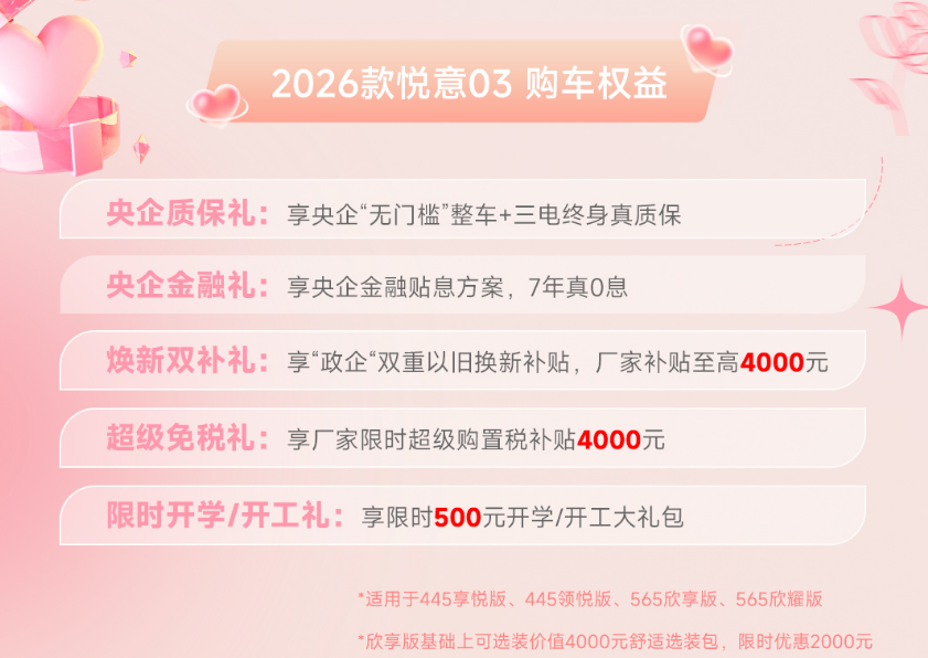 为了让更多家庭轻松拥有这份“悦意”,2026款悦意03还重磅推出央企五重礼遇。购车即享央企质保礼,“无门槛”整车及三电终身质保真诚以待,更有7年真0息央企金融礼,极大降低拥车门槛,同时,新车叠加焕新双补礼,政企双重以旧换新补贴至高4000元,以及限时4000元购置税补贴的超级免税礼、限时500元的开学/开工礼。特别值得一提的是,还有限时半价权益,可升级价值4000元的舒适选装包(具体优惠政策请详询当地经销商)。在这个女神节,让爱与梦想零负担启程。