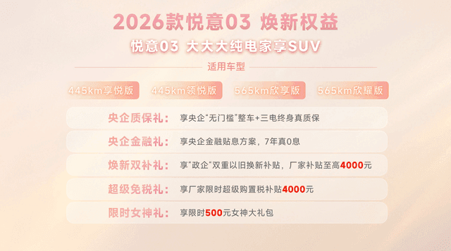 为了让更多家庭轻松拥有这份“悦意”,2026款悦意03还重磅推出央企五重礼遇。购车即享央企质保礼,“无门槛”整车及三电终身质保真诚以待,更有7年真0息央企金融礼,极大降低拥车门槛,同时,新车叠加焕新双补礼,政企双重以旧换新补贴至高4000元,以及限时4000元购置税补贴的超级免税礼、限时500元的开学/开工礼。特别值得一提的是,还有限时半价权益,可升级价值4000元的舒适选装包(具体优惠政策请详询当地经销商)。在这个女神节,让爱与梦想零负担启程。