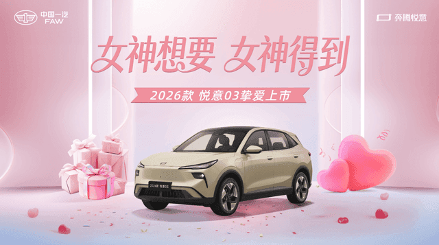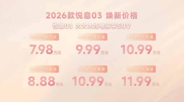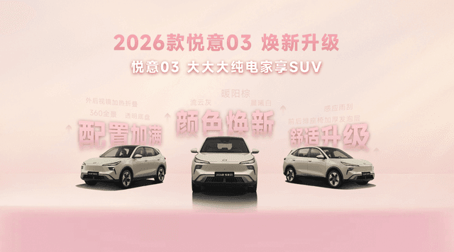三月春暖,悦见花开。3月8日妇女节,实力演员张若昀直播助阵,“大大大纯电家享SUV”焕新而来,2026款悦意03挚爱上市,为每一位女神献上春天的礼物。445km、565km两种续航共计6款车型,官方售价7.98-11.99万元。围绕年轻小家庭,尤其是家庭女性用户的进阶需求,从颜色推新到舒适满配,2026款悦意03带来全新晨晖金车色、晨曦白内饰色等20余项升级,让用车更舒心、开车更省心、养车更安心,正如张若昀所说:“悦意03是真舒适的纯电SUV。”当前购车还可享7年0息贷款、无门槛整车及三电终身质保等丰富权益,轻松开启高品质纯电生活。