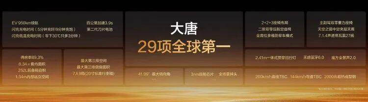 从最重要的动力系统来看,比亚迪大唐将会提供混动的DM-i/DM-P以及纯电的大唐EV版本,在第二代刀片电池+闪充技术的加持下,唐EV版本拥有950公里的超长续航,且电量从10%充至70%仅需5分钟,从10%充至97%只要9分钟,实现5分钟充好,9分钟充饱。
