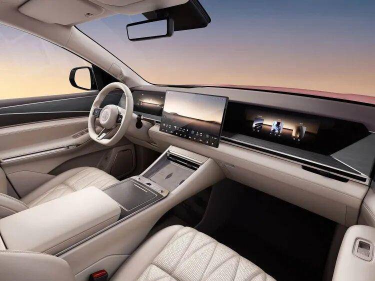 内饰采用环抱式设计,采用内嵌式液晶表盘+悬浮屏+副驾娱乐屏组成的三屏造型 ,且配有全新的三幅式方向盘、怀挡、HUD等,搭配大量的皮质包裹,类似木纹装饰,进一步提升内饰档次感。