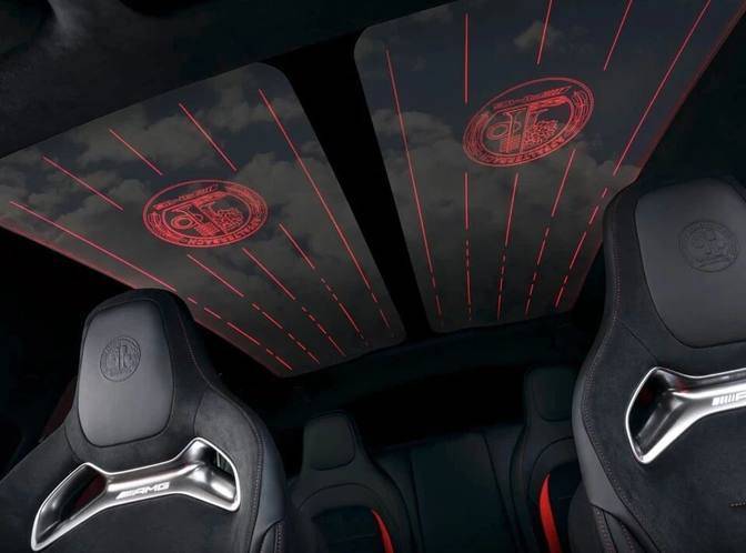 前排配备AMG专属高性能运动座椅,延续赛车级低坐姿设计,兼顾轻量化工艺,既能提供充足侧向支撑,也能优化座舱减重效果。后排座椅提供两种可选方案,可选择双独立座椅打造四座奢享布局,也能选常规三人座椅兼顾家用实用性。车顶搭载光感全景天幕,采光效果出众,还印有AMG发光品牌徽章,搭配贯穿式赛车运动条纹,让车顶设计兼具辨识度与运动感。