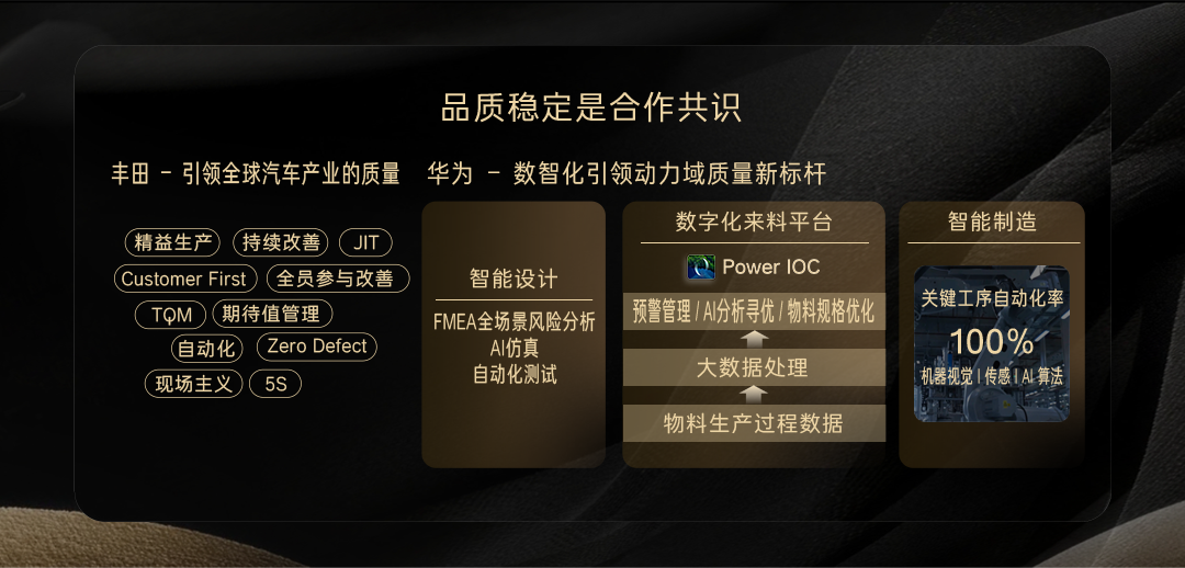 华为与丰田的合作,始于对“品质、稳定、安全”的深度共鸣。丰田凭借产品“靠谱”的口碑,赢得无数消费者的信赖,其精益生产、持续改善、品质优先的质量管理理念,成为全球企业追求高质量发展的共同财富。华为通过数字化能力的加持,从设计,到来料,再到制造,构建了一套端到端的华为智能电动质量体系: 在设计端结合全场景风险分析与AI仿真等技术,设计预设失效模式,把安全风险消灭在设计阶段;来料环节依托深度的原子工艺赋能与可视化过程的数据管理,实现物料生产过程风险预警;在制造环节,丰田严苛的品质管理流程加上华为的自动化产线、AI品控和数字化制造能力,实现造一台车和造N台车品质如一。