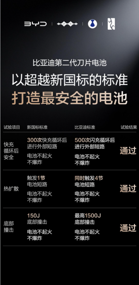 安全,始终是比亚迪刀片电池的立身之本,第二代产品更是将这份优势做到了超越国标。500次闪充循环后边充边针刺,无热失控、无起火,相当于电池用15年依旧安全;同时触发 4节电池短路的热扩散试验,周围电芯温度正常;10倍新国标能量的底部撞击,电池依旧安然无恙。