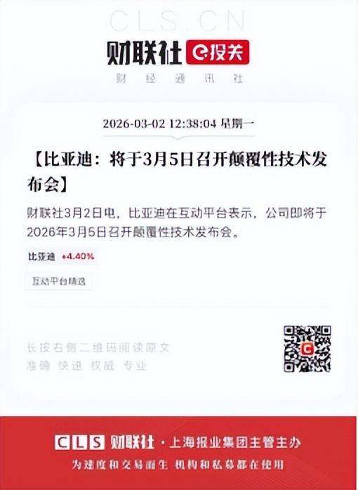 技术始终是比亚迪的核心底气,近期更是接连释放利好信号。3月2日,比亚迪通过互动平台官宣,将于3月5日举办颠覆性技术发布会,消息一经发布立刻引爆资本市场,当日公司A股股价直接上涨8.36%。资本市场的这份正向反馈,恰恰印证了投资者对比亚迪技术实力的认可,也折射出市场对其未来发展的满满信心。