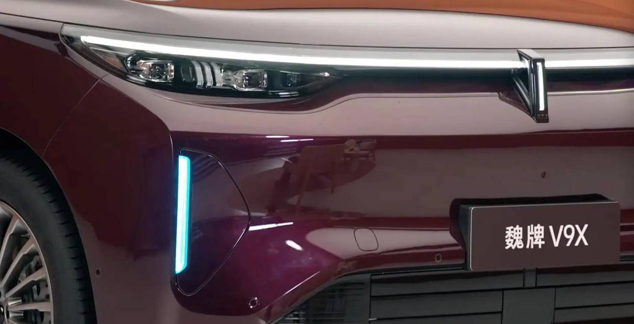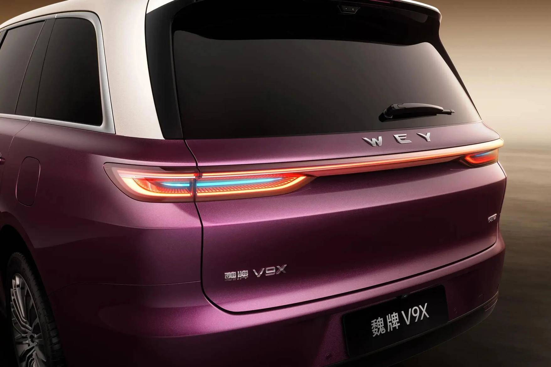 车尾部分,魏牌V9X同样采用贯穿式尾灯组,并配备辅助驾驶专属蓝色指示灯。作为插电混动车型,该车采用隐藏式排气布局,有效弱化传统排气结构,尾部牌照区域集成于后保险杠上方。