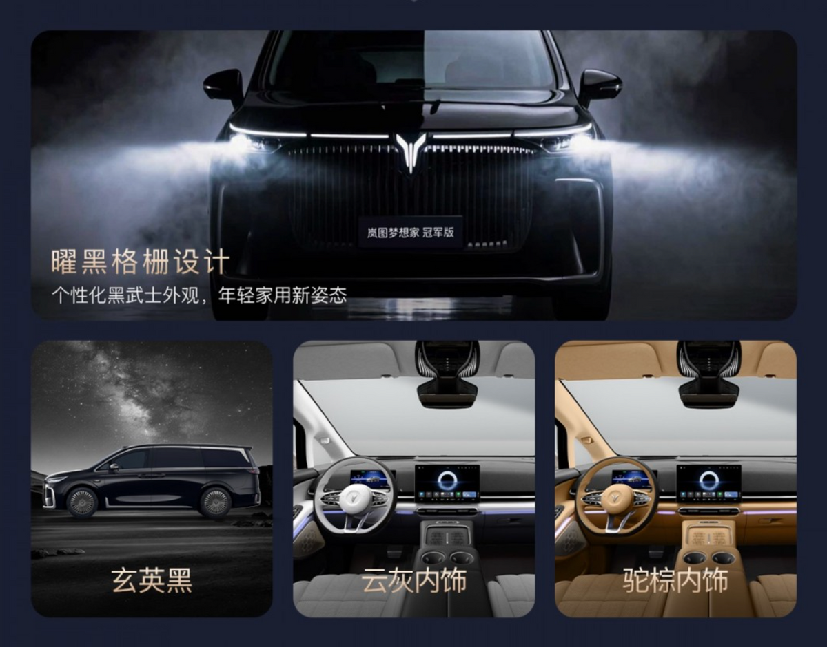 在配色上,冠军版仅提供玄英黑一种车漆,内饰提供驼棕、云灰、云灰/驼棕三种选择。