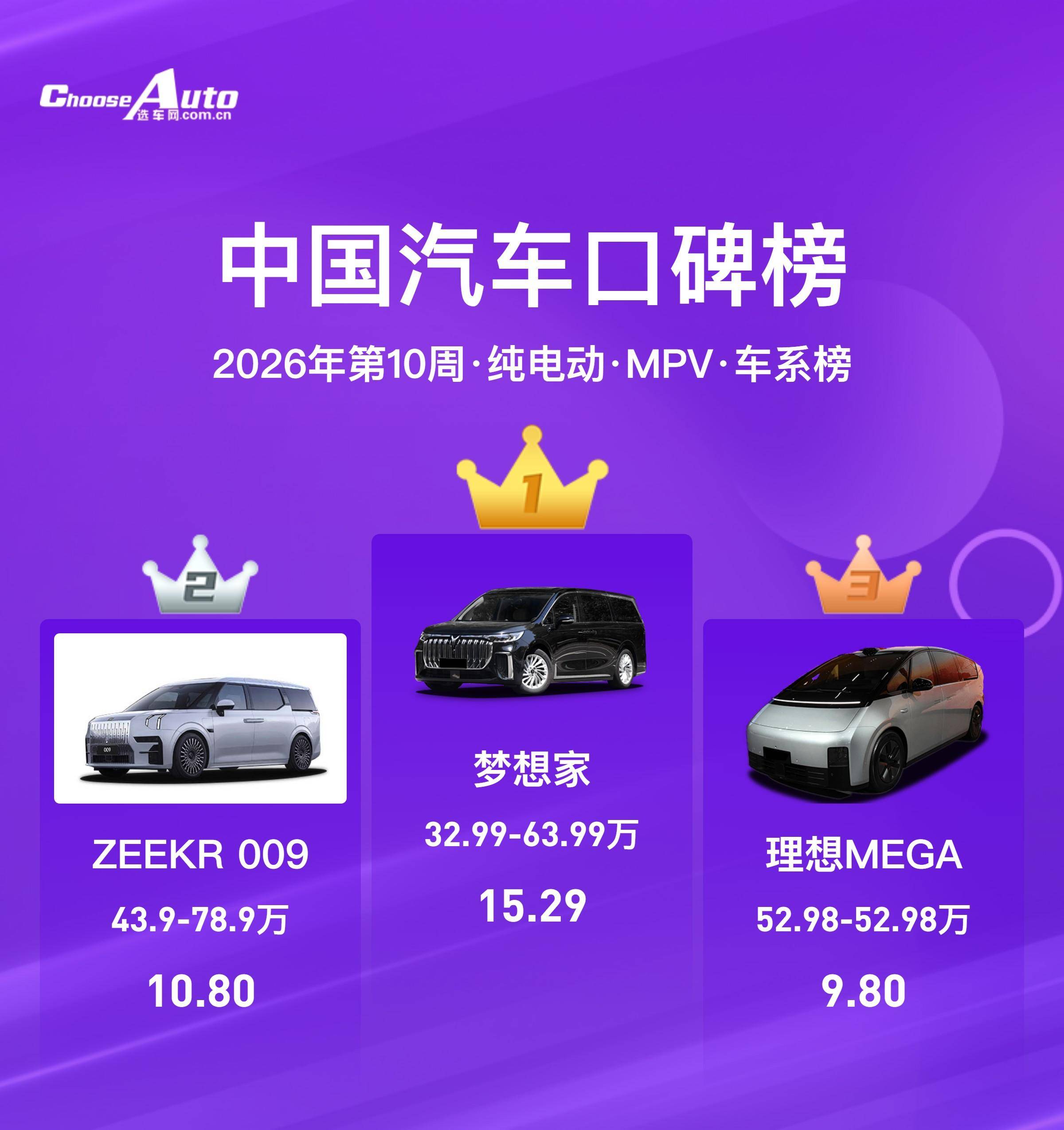 MPV榜单:梦想家(15.29分)、ZEEKR 009(10.80分)、理想MEGA(9.80分)。